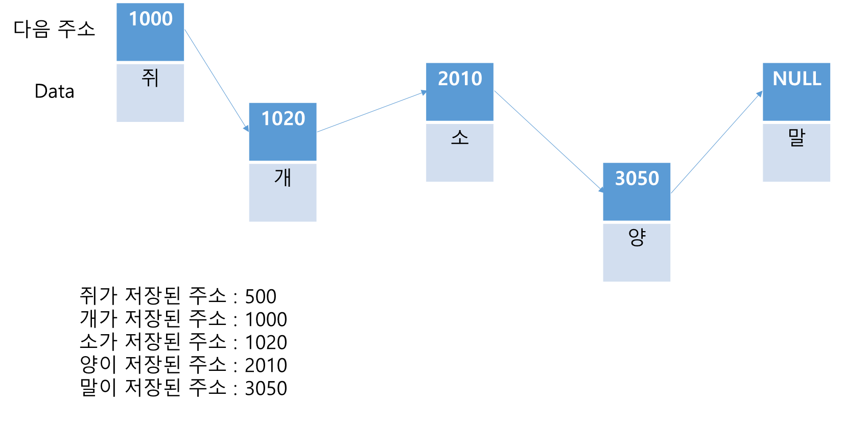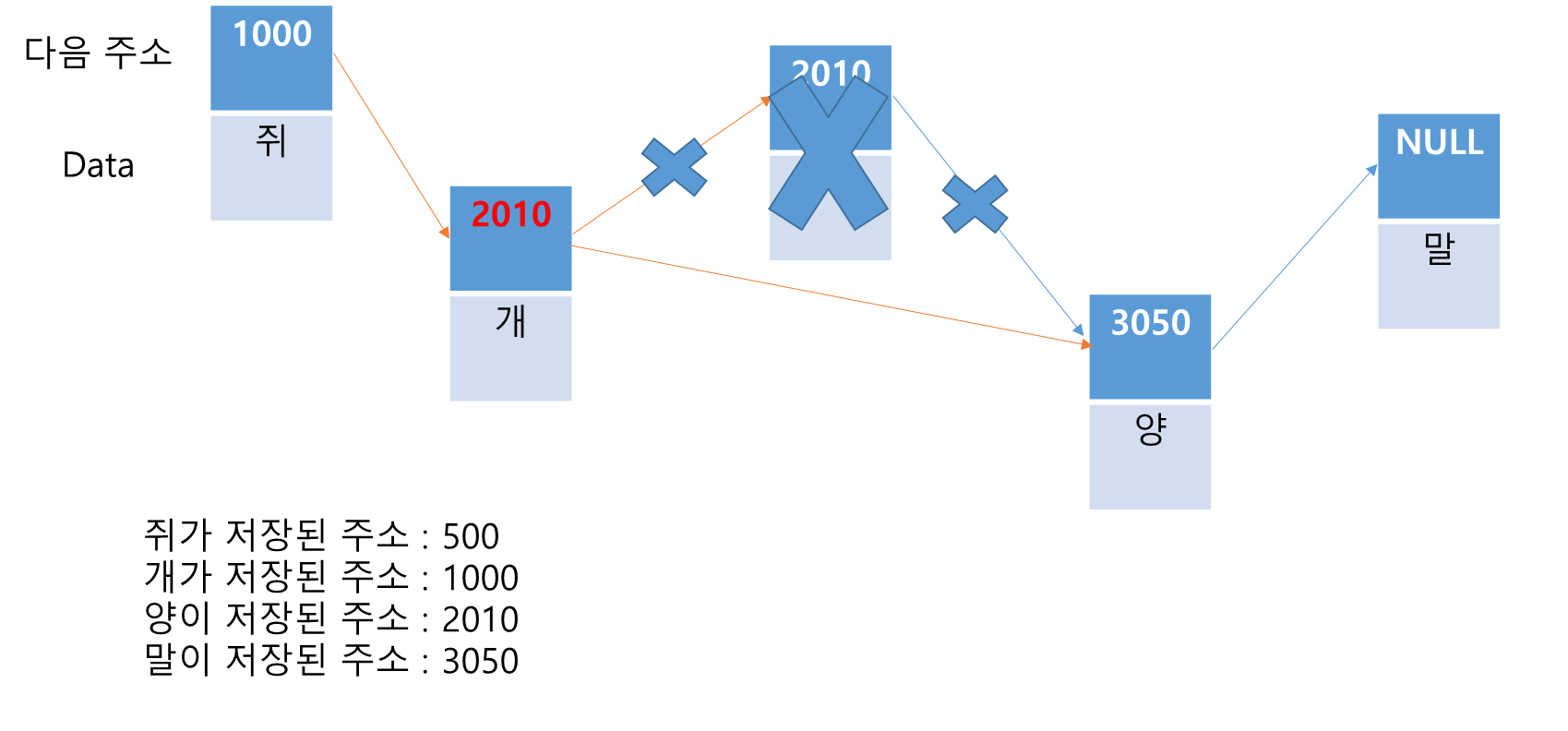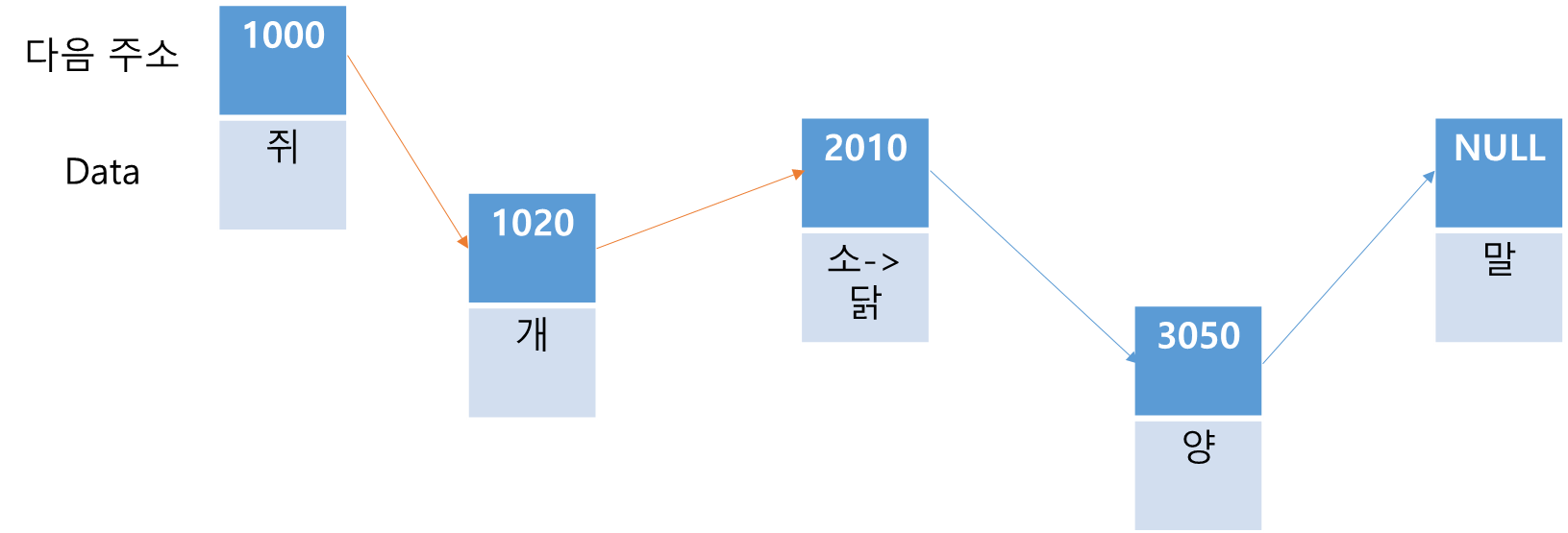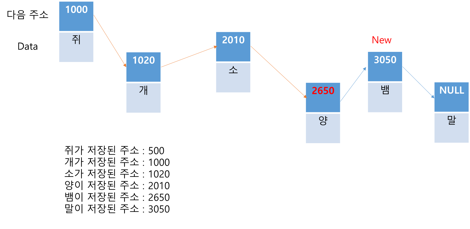 이후, '양'이 가리킬 다음 주소에 어느 메모리에 새롭게 저장된 '뱀'의 주소를 저장하고, '뱀'은 다음 주소인 '말'을 가리킨다. 이 동작도 O(1)이다.