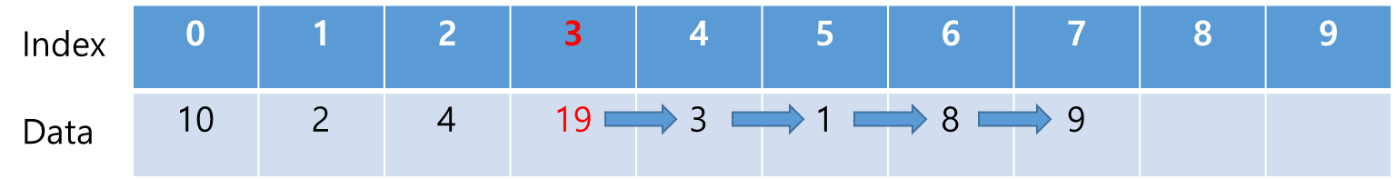 인덱스 3 위치에 데이터 19를 추가한다고 하면, 인덱스 3 우측에 있는 데이터들이 한 칸씩 우측으로 밀려난다.
