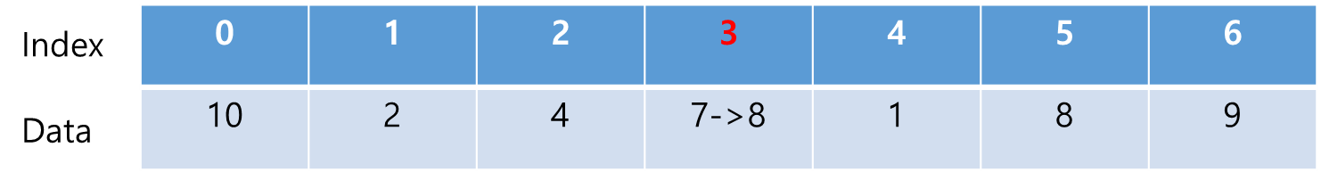 위의 배열에서 인덱스 3에 있는 7이란 데이터를 8로 변경한다고 하자.