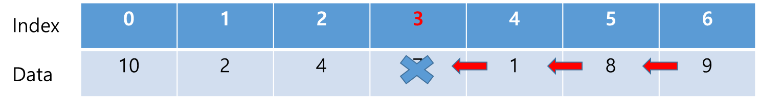 위의 배열에서 인덱스 3에 있는 7이란 데이터를 삭제한다고 하자.