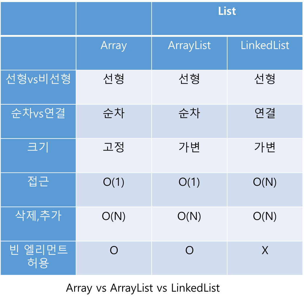 (Array와 List의 차이를 묻는 것은 Array와 LinkedList의 차이를 묻는 것이 일반적이다.)