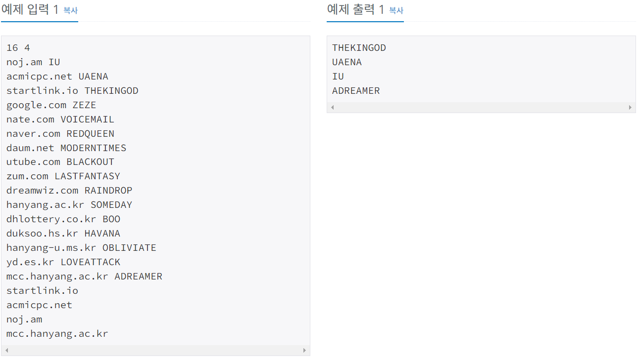 첫째 줄에 저장된 사이트 주소의 수 N(1 ≤ N ≤ 100,000)과 비밀번호를 찾으려는 사이트 주소의 수 M(1 ≤ M ≤ 100,000)이 주어진다.