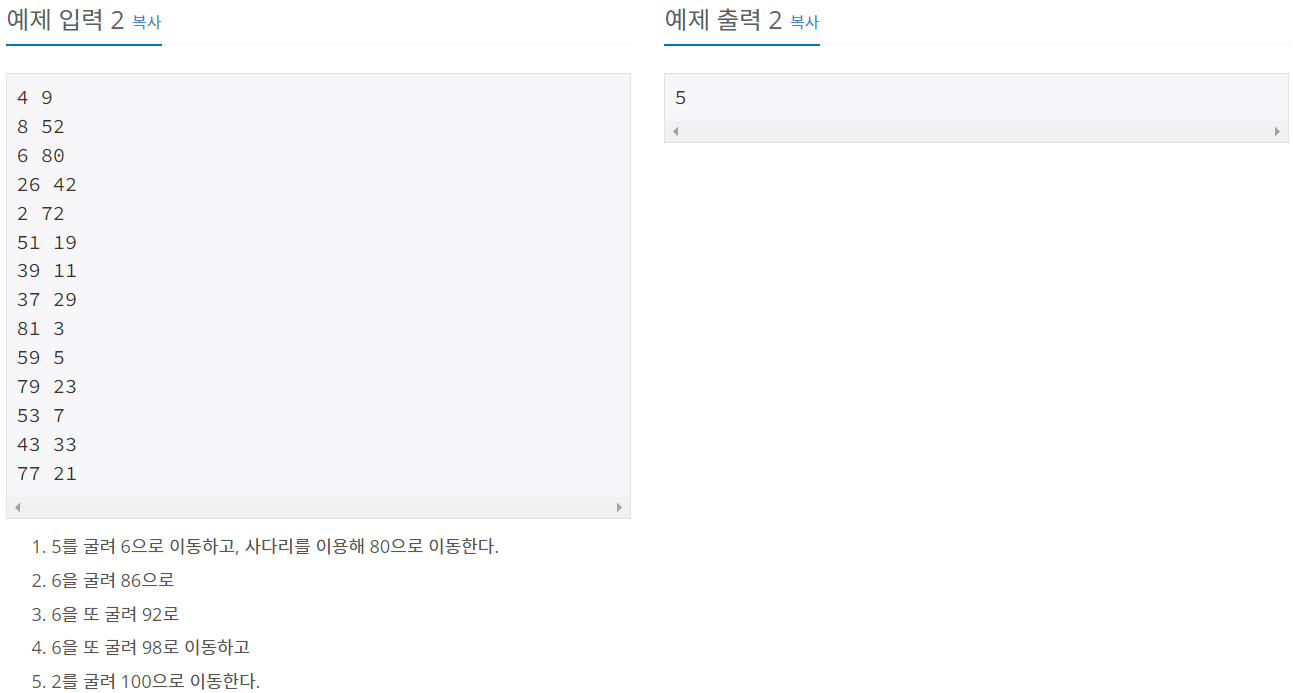 1번 칸과 100번 칸은 뱀과 사다리의 시작 또는 끝이 아니다. 모든 칸은 최대 하나의 사다리 또는 뱀을 가지고 있으며, 동시에 두 가지를 모두 가지고 있는 경우는 없다. 항상 100번 칸에 도착할 수 있는 입력만 주어진다.
