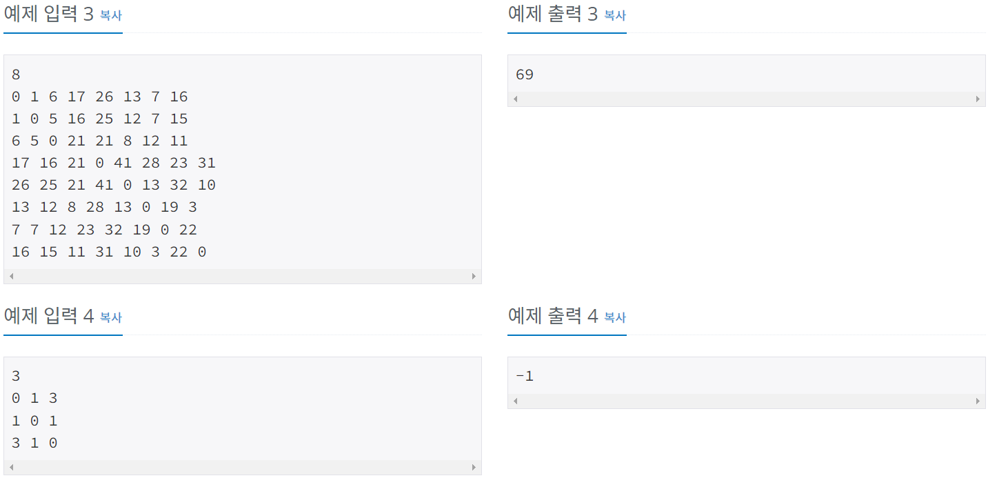 첫째 줄에 도시의 개수 N(1 ≤ N ≤ 20)이 주어진다. 둘째 줄부터 N개의 줄에 각각의 도시 사이에 이동하는데 필요한 시간이 주어진다. A에서 B로 가는 시간과 B에서 A로 가는 시간은 같다. 또, A와 B가 같은 경우에는 0이 주어지고, 그 외의 경우에 필요한 시간은 2500보다 작거나 같은 자연수이다.
