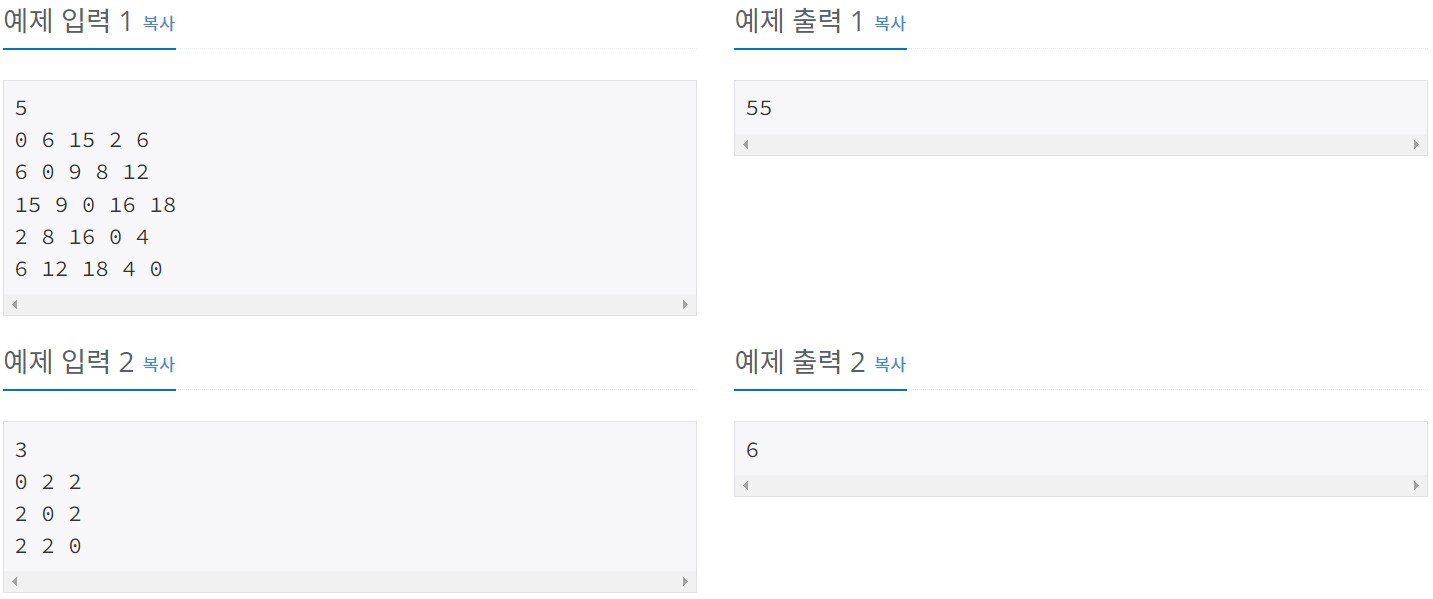 모든 쌍의 도시 사이의 최소 이동 시간이 주어졌을 때, 이 나라에 존재할 수 있는 도로의 개수의 최솟값일 때, 모든 도로의 시간의 합을 구하는 프로그램을 작성하시오.
