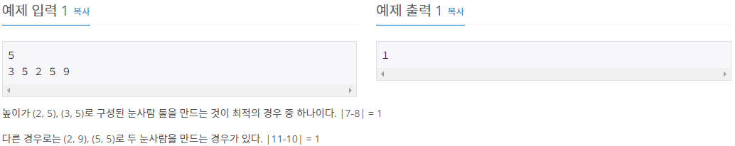 주어진 N개의 눈덩이를 이용하여 만들 수 있는 두 눈사람의 키 차이 중 최솟값을 구하는 프로그램을 작성하시오.