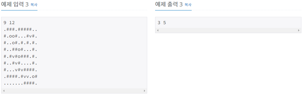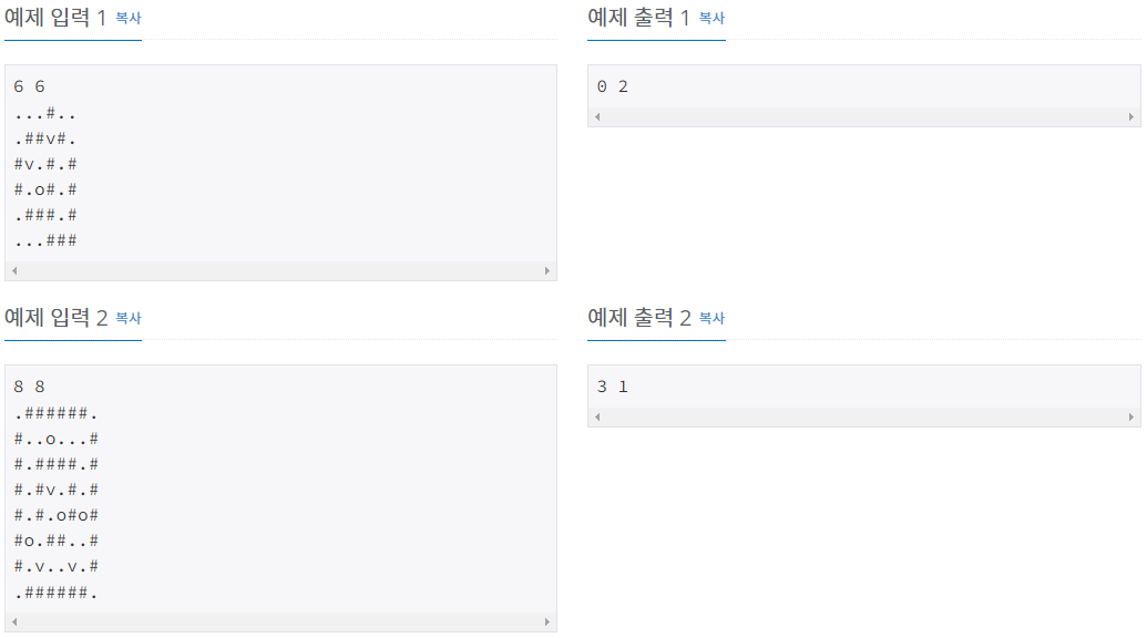 벽이 아닌 곳을 만날 때마다 bfs를 돌리고, 방문 가능한 구역을 모두 방문함으로써 구역을 나누는 건 visited 배열로(방문 체크) 쉽게 구현할 수 있다. 여기서 구역마다 o의 수와 v의 수를 구하고, o>v라면 v는 0이 되고(늑대가 죽는다), o<=v라면 o는 0이 된다(양이 죽는다). 이렇게 구역마다 살아남은 o와 v의 수를 합산하여 출력하면 된다.
