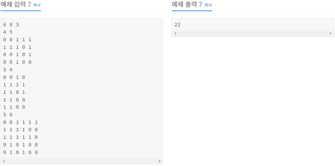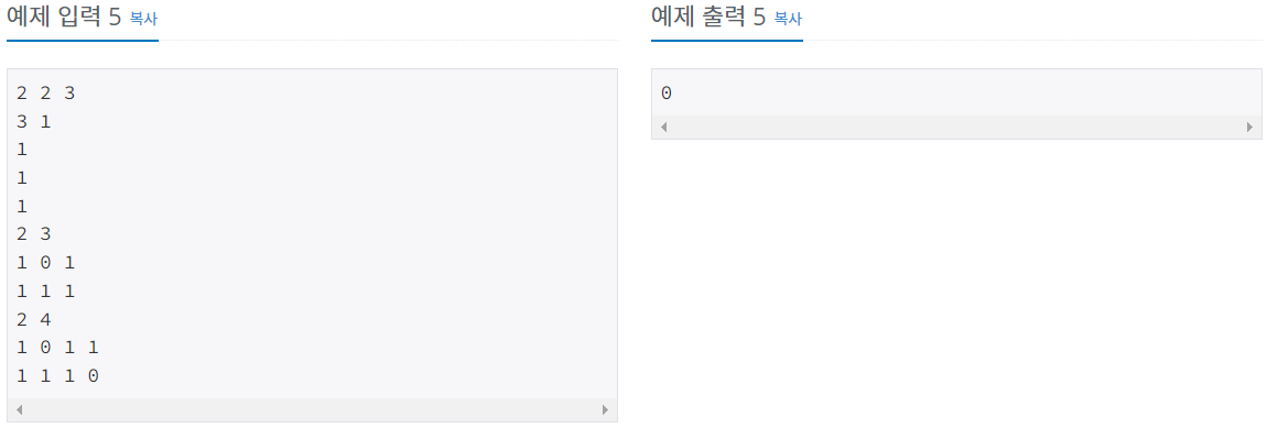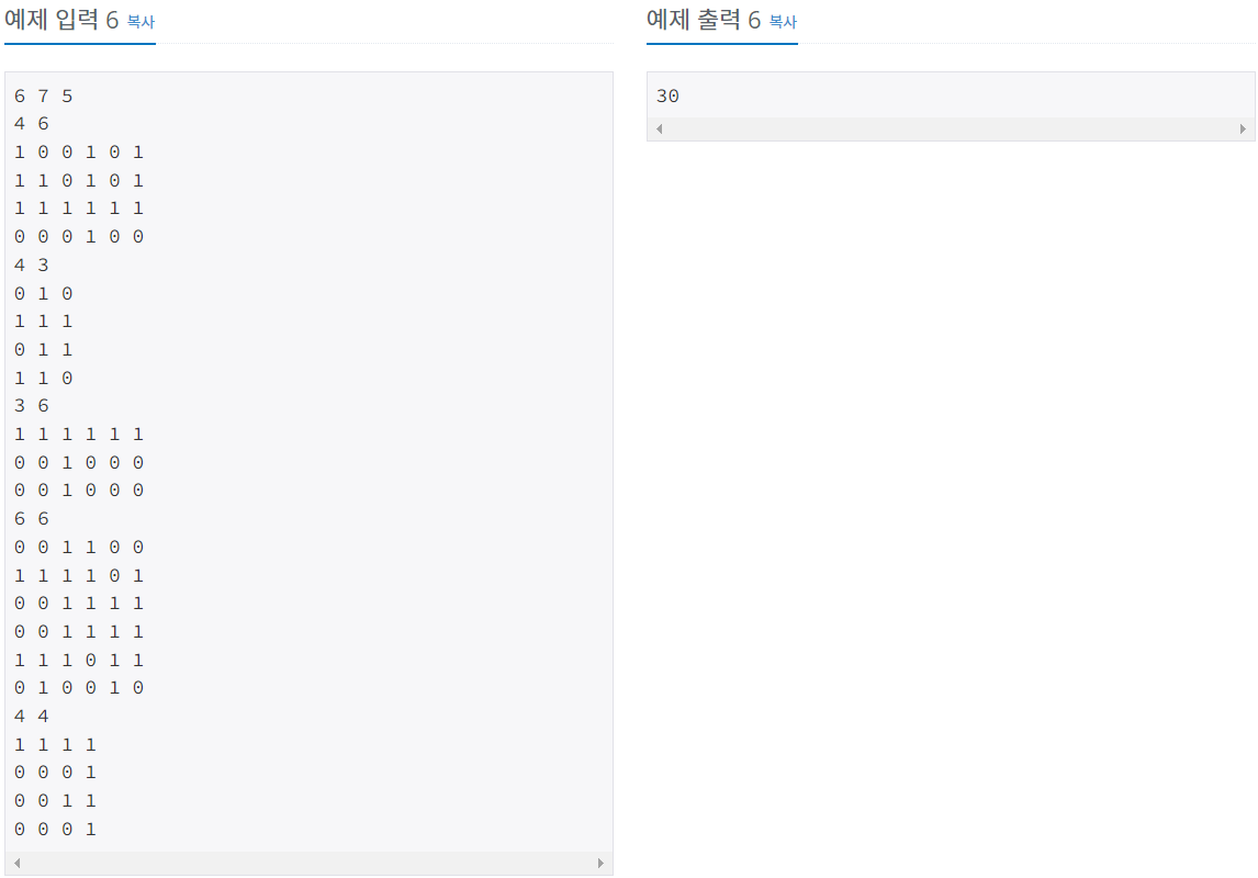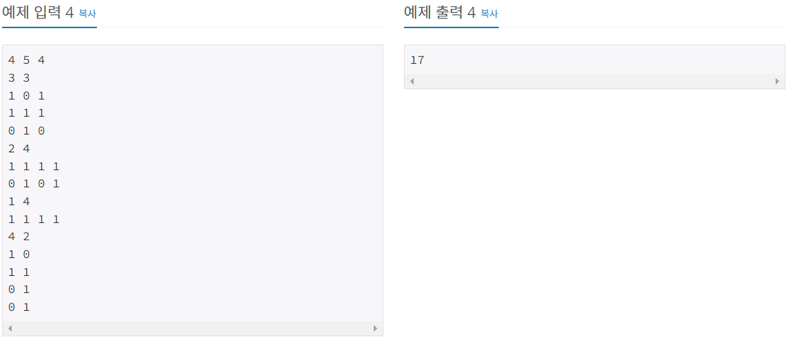 다음 Ri개의 줄에는 각 줄마다 모눈종이의 각 행을 나타내는 Ci개의 정수가 한 개의 빈칸을 사이에 두고 주어진다. 각 칸에 들어가는 값은 0, 1이다. 0은 스티커가 붙지 않은 칸을, 1은 스티커가 붙은 칸을 의미한다.