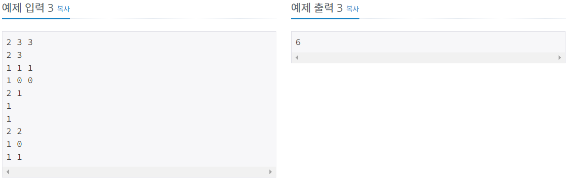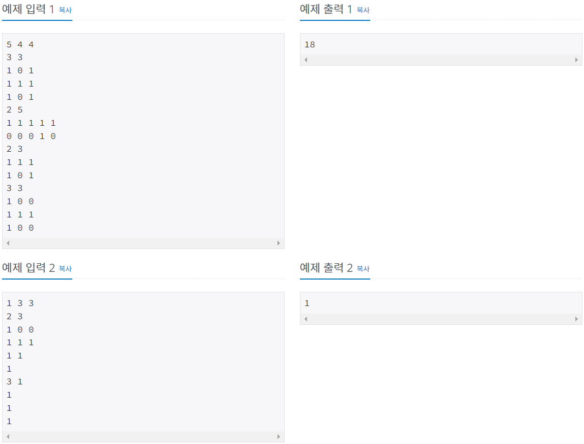첫째 줄에 노트북의 세로와 가로 길이를 나타내는 N(1 ≤ N ≤ 40)과 M(1 ≤ M ≤ 40), 그리고 스티커의 개수 K(1 ≤ K ≤ 100)이 한 칸의 빈칸을 사이에 두고 주어진다.