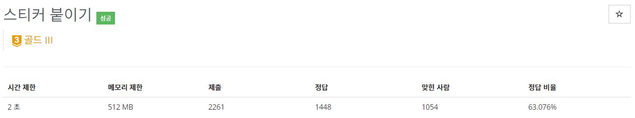 - 세 번째 스티커는 스티커를 시계방향으로 0, 90, 180, 270도 회전시킨 모양에 대해 전부 확인을 해도 스티커를 붙일 수 있는 공간이 없다. 그러므로 해당 스티커를 붙이지 않고 버린다.