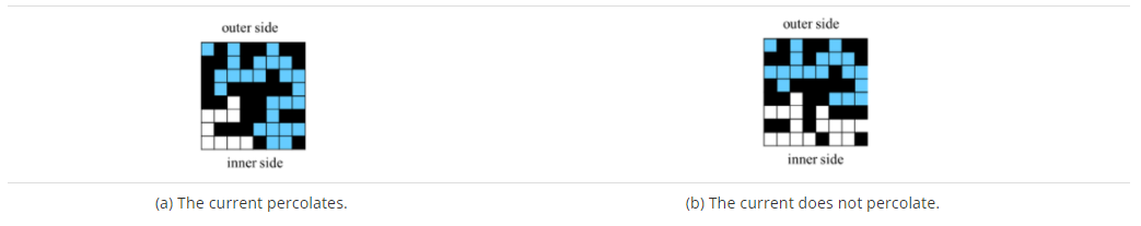 인제대학교 생화학연구실에 재직중인 석교수는 전류가 침투(percolate) 할 수 있는 섬유 물질을 개발하고 있다. 이 섬유 물질은 2차원 M × N 격자로 표현될 수 있다. 편의상 2차원 격자의 위쪽을 바깥쪽(outer side), 아래쪽을 안쪽(inner side)라고 생각하기로 한다. 또한 각 격자는 검은색 아니면 흰색인데, 검은색은 전류를 차단하는 물질임을 뜻하고 흰색은 전류가 통할 수 있는 물질임을 뜻한다. 전류는 섬유 물질의 가장 바깥쪽 흰색 격자들에 공급되고, 이후에는 상하좌우로 인접한 흰색 격자들로 전달될 수 있다.