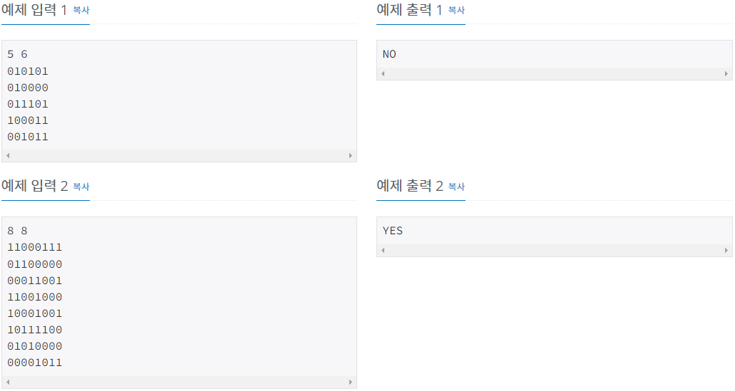 김 교수가 개발한 섬유 물질을 나타내는 정보가 2차원 격자 형태로 주어질 때, 바깥쪽에서 흘려 준 전류가 안쪽까지 침투될 수 있는지 아닌지를 판단하는 프로그램을 작성하시오.