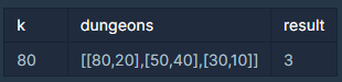 이 게임에는 하루에 한 번씩 탐험할 수 있는 던전이 여러개 있는데, 한 유저가 오늘 이 던전들을 최대한 많이 탐험하려 합니다. 유저의 현재 피로도 k와 각 던전별 "최소 필요 피로도", "소모 피로도"가 담긴 2차원 배열 dungeons 가 매개변수로 주어질 때, 유저가 탐험할수 있는 최대 던전 수를 return 하도록 solution 함수를 완성해주세요.