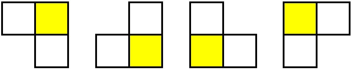 길동이는 이처럼 넓은 사각형 형태의 나무 재료를 잘라서 여러 개의 부메랑을 만들고자 한다. 그리고 부메랑은 항상 3칸을 차지하는 ‘ㄱ’모양으로 만들어야 한다. 따라서 부메랑의 가능한 모양은 다음과 같이 총 4가지다.