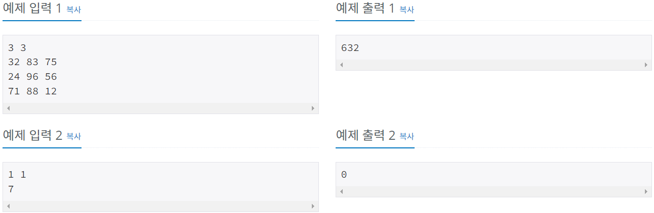 첫째 줄에는 길동이가 가지고 있는 나무 재료의 세로, 가로 크기를 의미하는 두 자연수 N, M이 주어진다. (1 ≤ N, M ≤ 5) 다음 N개의 줄에 걸쳐서, 매 줄마다 나무 재료의 각 위치의 강도를 나타내는 M개의 자연수 K가 공백을 기준으로 구분되어 주어진다. (1 ≤ K ≤ 100)