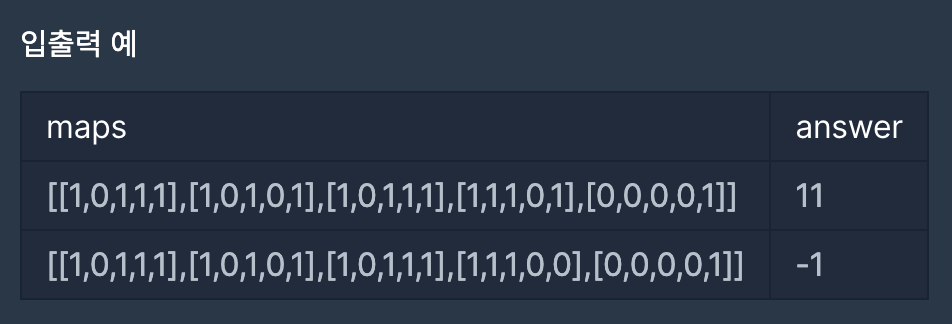 게임 맵의 상태 maps가 매개변수로 주어질 때, 캐릭터가 상대 팀 진영에 도착하기 위해서 지나가야 하는 칸의 개수의 최솟값을 return 하도록 solution 함수를 완성해주세요. 단, 상대 팀 진영에 도착할 수 없을 때는 -1을 return 해주세요.