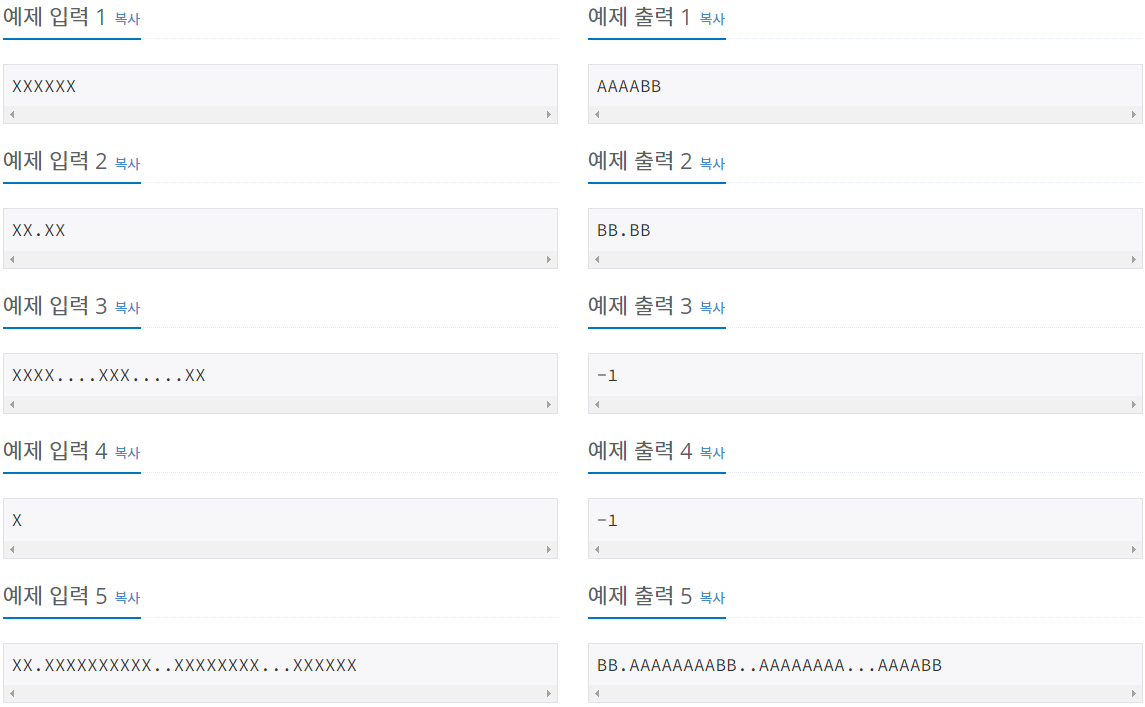 이제 '.'와 'X'로 이루어진 보드판이 주어졌을 때, 민식이는 겹침없이 'X'를 모두 폴리오미노로 덮으려고 한다. 이때, '.'는 폴리오미노로 덮으면 안 된다.
