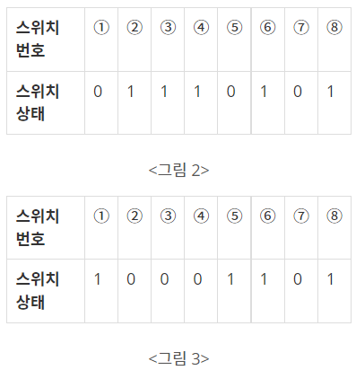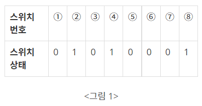 1부터 연속적으로 번호가 붙어있는 스위치들이 있다. 스위치는 켜져 있거나 꺼져있는 상태이다. <그림 1>에 스위치 8개의 상태가 표시되어 있다. ‘1’은 스위치가 켜져 있음을, ‘0’은 꺼져 있음을 나타낸다. 그리고 학생 몇 명을 뽑아서, 학생들에게 1 이상이고 스위치 개수 이하인 자연수를 하나씩 나누어주었다. 학생들은 자신의 성별과 받은 수에 따라 아래와 같은 방식으로 스위치를 조작하게 된다.