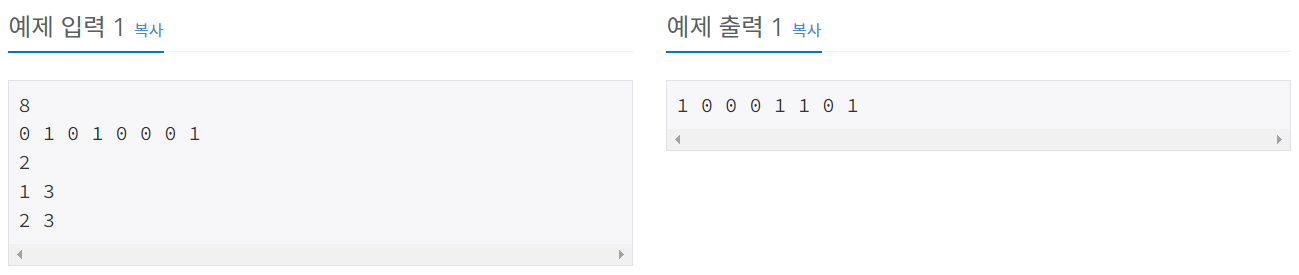 첫째 줄에는 스위치 개수가 주어진다. 스위치 개수는 100 이하인 양의 정수이다. 둘째 줄에는 각 스위치의 상태가 주어진다. 켜져 있으면 1, 꺼져있으면 0이라고 표시하고 사이에 빈칸이 하나씩 있다. 셋째 줄에는 학생수가 주어진다. 학생수는 100 이하인 양의 정수이다. 넷째 줄부터 마지막 줄까지 한 줄에 한 학생의 성별, 학생이 받은 수가 주어진다. 남학생은 1로, 여학생은 2로 표시하고, 학생이 받은 수는 스위치 개수 이하인 양의 정수이다. 학생의 성별과 받은 수 사이에 빈칸이 하나씩 있다.