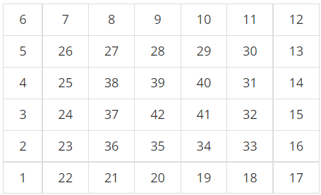 아래 그림은 7×6공연장에서 대기번호 1번부터 42번까지의 관객이 좌석에 배정된 결과를 보여주고 있다.