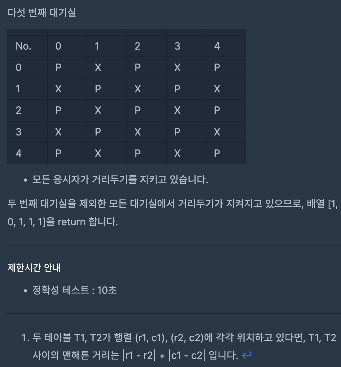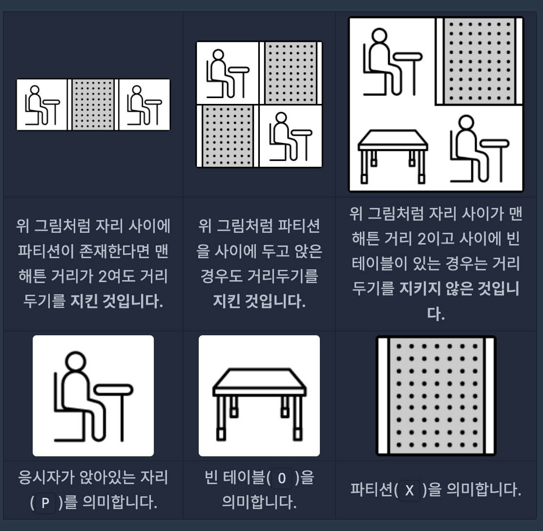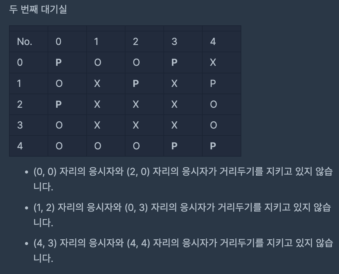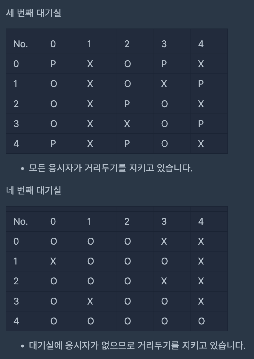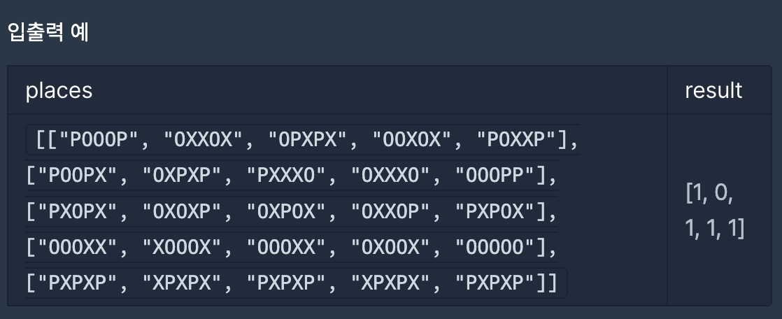 5개의 대기실을 본 죠르디는 각 대기실에서 응시자들이 거리두기를 잘 기키고 있는지 알고 싶어졌습니다. 자리에 앉아있는 응시자들의 정보와 대기실 구조를 대기실별로 담은 2차원 문자열 배열 places가 매개변수로 주어집니다. 각 대기실별로 거리두기를 지키고 있으면 1을, 한 명이라도 지키지 않고 있으면 0을 배열에 담아 return 하도록 solution 함수를 완성해 주세요.