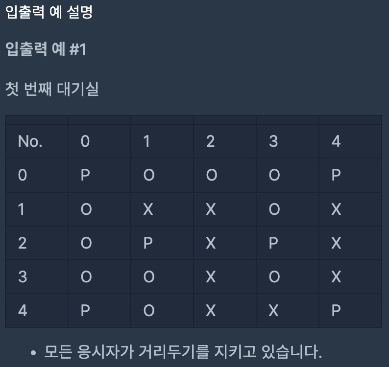 - 입력으로 주어지는 5개 대기실의 크기는 모두 5x5 입니다.