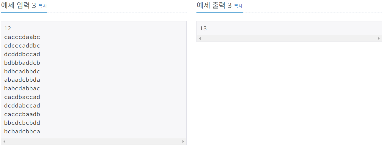 첫째 줄에 단어의 개수 N이 주어진다. 둘째 줄부터 N개의 줄에 한 줄에 하나씩 단어가 주어진다. 단어의 길이는 최대 50이고, N은 100보다 작거나 같은 자연수이다. 모든 단어의 길이는 같고, 중복되지 않는다. 또, 알파벳 소문자로만 이루어져 있다.
