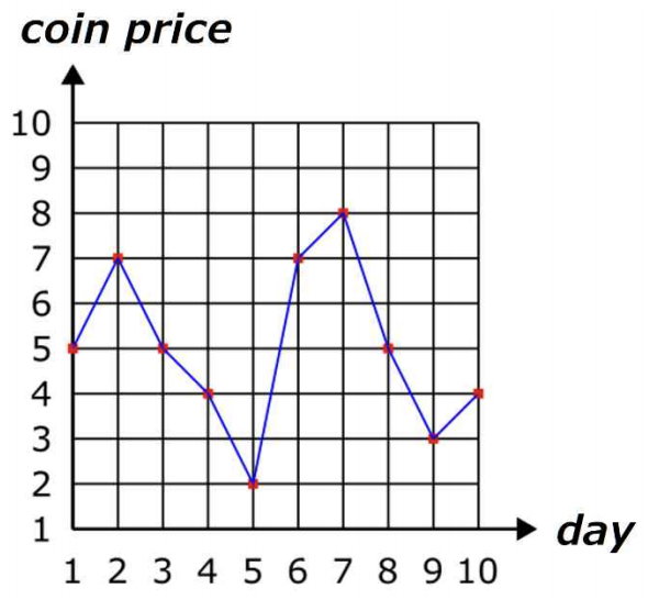 예를 들어, 그림 1과 같은 바이트 코인 등락 그래프를 첫날 미리 알 수 있다고 하고 우리에게 주어진 초기 현금이 24라고 하자. 수익을 최대한 높이려면 다음과 같이 바이트 코인을 매수, 매도할 수 있다. 첫 날 현금 20을 써서 4개의 코인을 산다. 둘째 날 모든 코인을 매도해서 현금 28을 얻고 모두 32의 현금을 갖게 된다. 5일째 되는 날 현금 32를 써서 16개의 코인을 매수한다. 7일째 되는 날 모든 코인을 매도해서 모두 128의 현금을 갖게 된다. 9일째 되는 날 현금 126을 써서 42개의 코인을 사고 10일 날 모든 코인을 매도한다. 그러면 10일 날 현금이 170이 되고 이것이 최대이다.