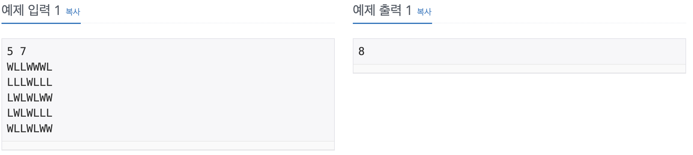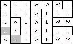 보물섬 지도를 발견한 후크 선장은 보물을 찾아나섰다. 보물섬 지도는 아래 그림과 같이 직사각형 모양이며 여러 칸으로 나뉘어져 있다. 각 칸은 육지(L)나 바다(W)로 표시되어 있다. 이 지도에서
