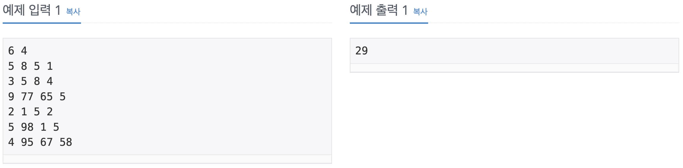 첫줄에 지구와 달 사이 공간을 나타내는 행렬의 크기를 나타내는 N, M (2≤ N, M ≤ 6)이 주어진다. 다음 N줄 동안 각 행렬의 원소 값이 주어진다. 각 행렬의 원소값은 100 이하의 자연수이다.