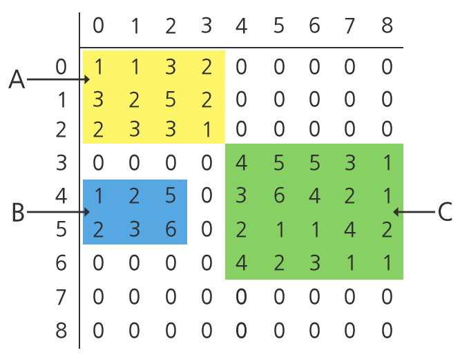 부분 행렬의 열의 개수는 서로 다르며 행렬의 행의 개수도 서로 다르다.