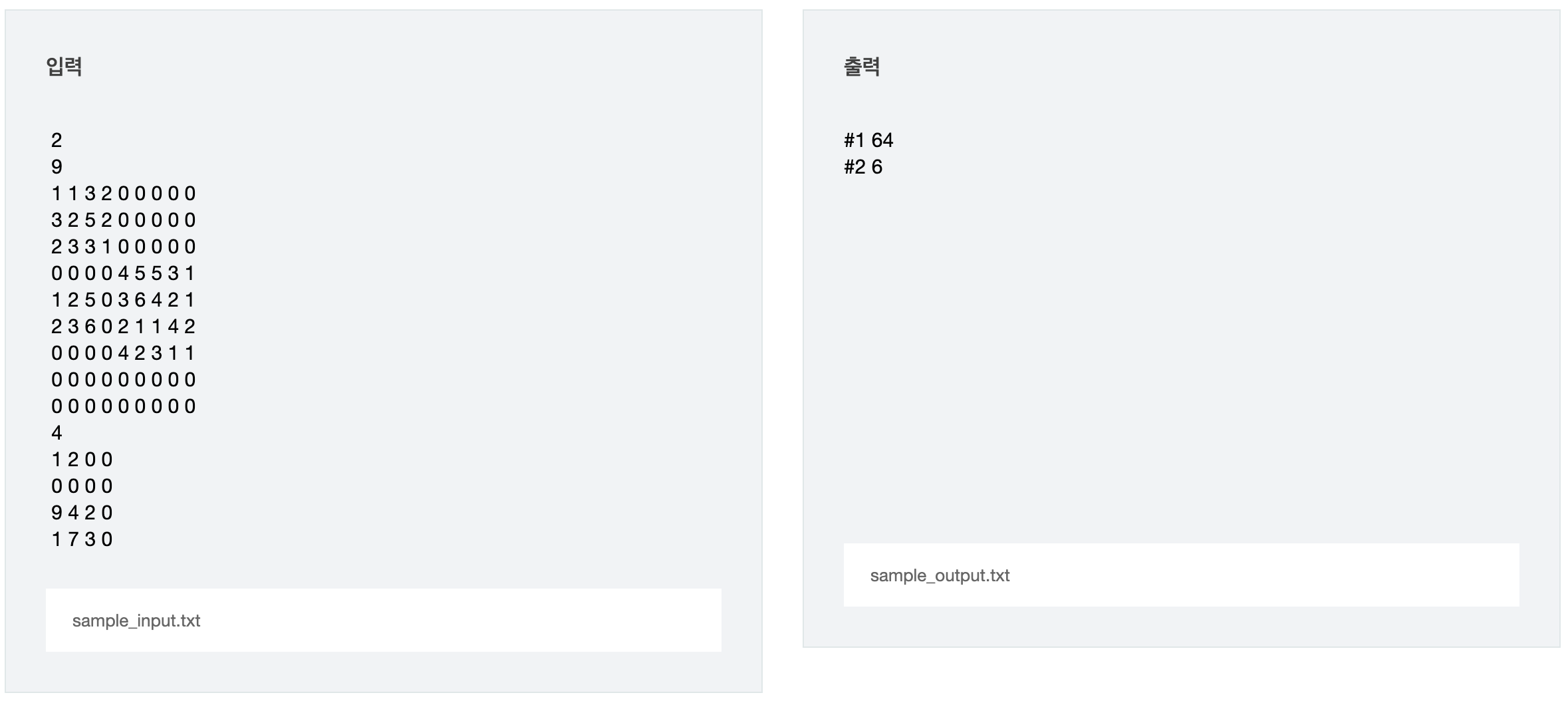 각 테스트 케이스는 (n+1) 줄로 구성되며, 첫 줄에는 양의 정수인 n이 주어지고, 다음 n줄에는 n x n 행렬이 (각 행이 한 줄에) 주어진다.