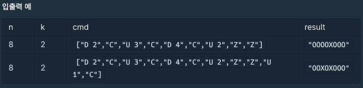 처음 표의 행 개수를 나타내는 정수 n, 처음에 선택된 행의 위치를 나타내는 정수 k, 수행한 명령어들이 담긴 문자열 배열 cmd가 매개변수로 주어질 때, 모든 명령어를 수행한 후 표의 상태와 처음 주어진 표의 상태를 비교하여 삭제되지 않은 행은 O, 삭제된 행은 X로 표시하여 문자열 형태로 return 하도록 solution 함수를 완성해주세요.