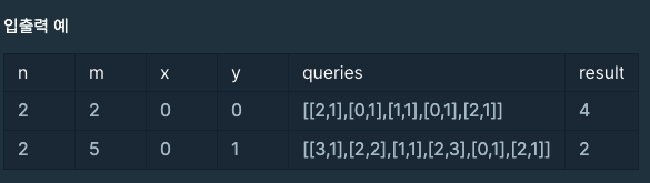 격자의 행의 개수 n, 열의 개수 m, 정수 x와 y, 그리고 쿼리들의 목록을 나타내는 2차원 정수 배열 queries가 매개변수로 주어집니다. n × m개의 가능한 시작점에 대해서 해당 시작점에 공을 두고 queries 내의 쿼리들을 순서대로 시뮬레이션했을 때, x행 y열에 도착하는 시작점의 개수를 return 하도록 solution 함수를 완성해주세요.