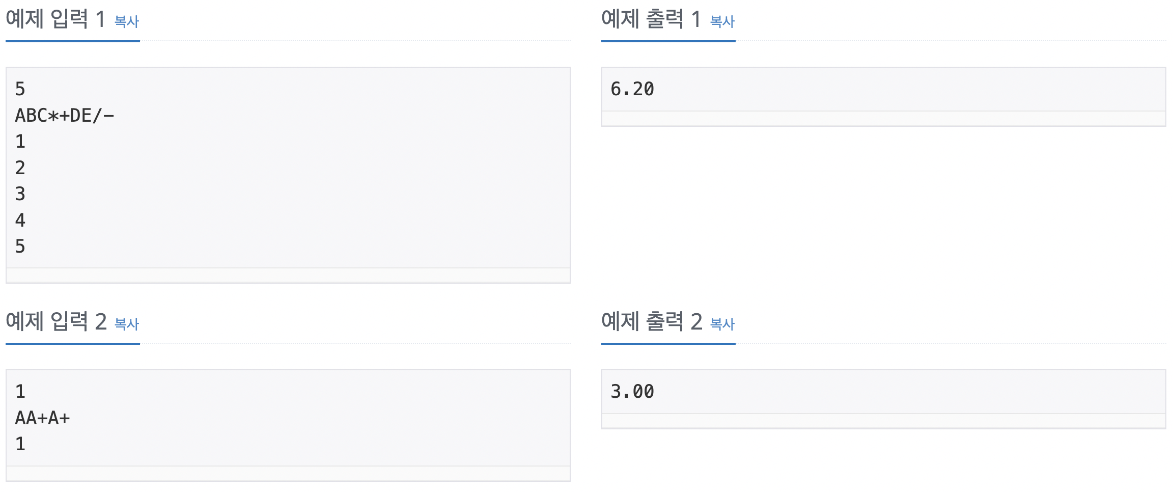 첫째 줄에 피연산자의 개수(1 ≤ N ≤ 26) 가 주어진다. 그리고 둘째 줄에는 후위 표기식이 주어진다. (여기서 피연산자는 A~Z의 영대문자이며, A부터 순서대로 N개의 영대문자만이 사용되며, 길이