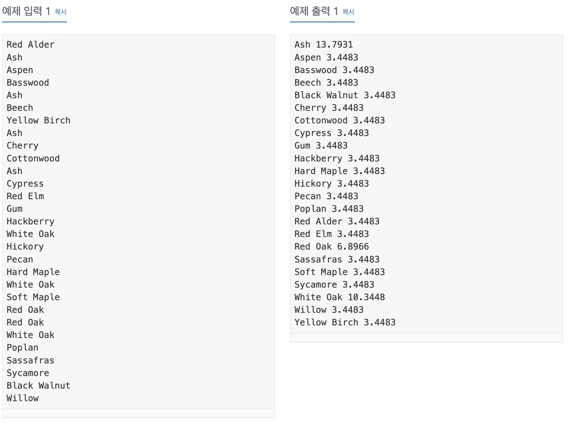 생태학에서 나무의 분포도를 측정하는 것은 중요하다. 그러므로 당신은 미국 전역의 나무들이 주어졌을 때, 각 종이 전체에서 몇 %를 차지하는지 구하는 프로그램을 만들어야 한다.