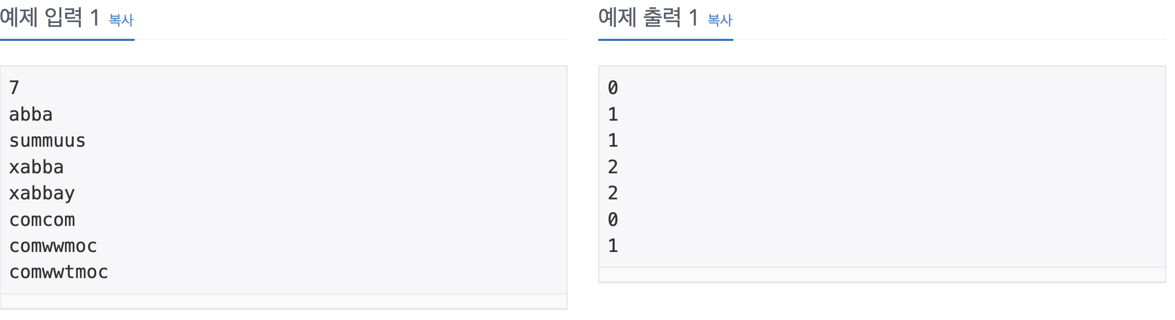 여러분은 제시된 문자열을 분석하여 그것이 그 자체로 회문인지, 또는 한 문자를 삭제하면 회문이 되는 “유사회문”인지, 아니면 회문이나 유사회문도 아닌 일반 문자열인지를 판단해야 한다. 만일 문자열 그 자체로 회문이면 0, 유사회문이면 1, 그 외는 2를 출력해야 한다.