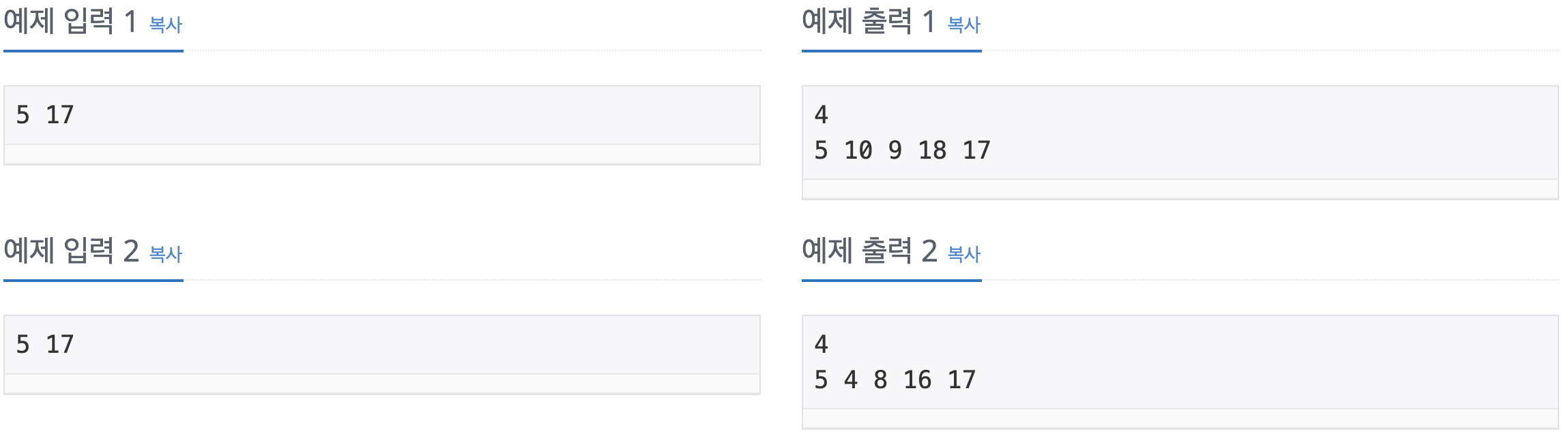 본인의 코드는 5 4 8 16 17이 나오는데 처음에 예제 2를 보지 못하고 10분 정도 디버깅 했다.