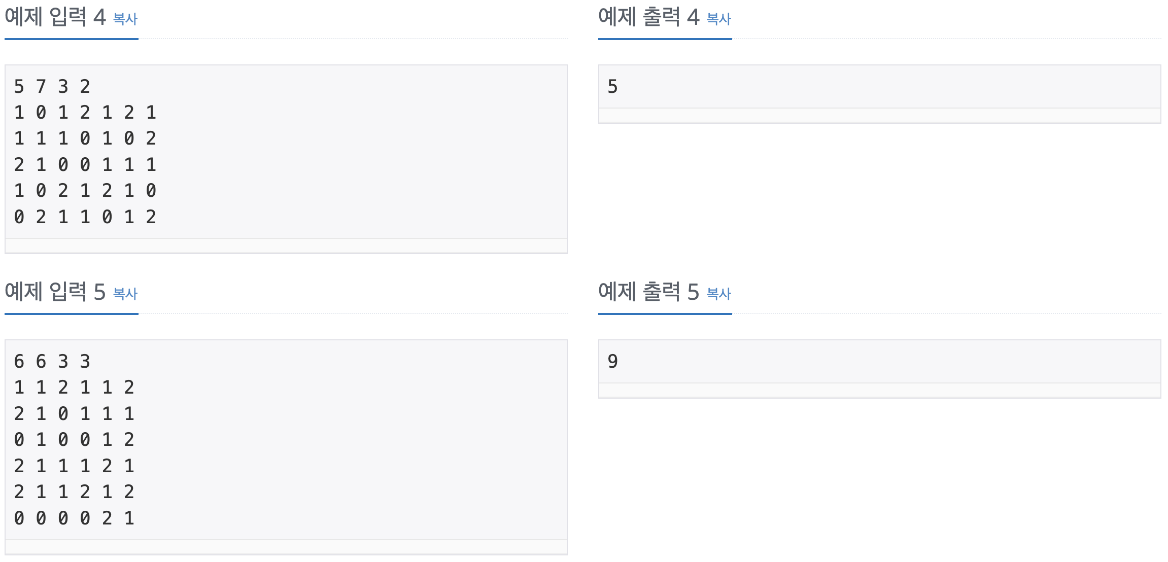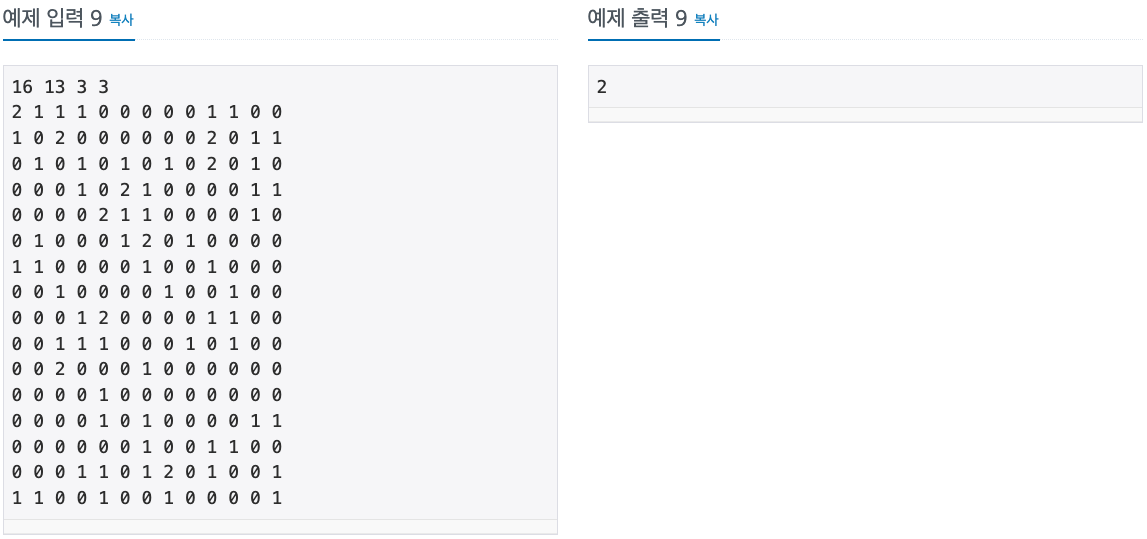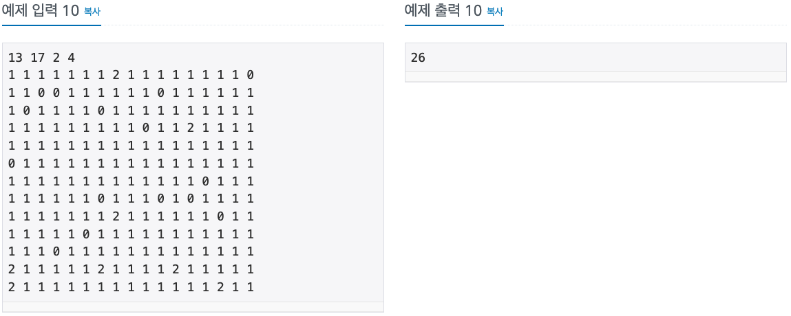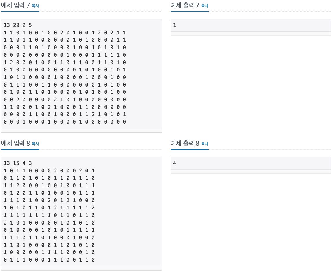 그 다음 N개의 줄에는 각 줄마다 정원의 각 행을 나타내는 M개의 정수가 한 개의 빈 칸을 사이에 두고 주어진다. 각 칸에 들어가는 값은 0, 1, 2이다. 0은 호수, 1은 배양액을 뿌릴 수 없는 땅, 2는 배양액을 뿌릴 수 있는 땅을 의미한다.