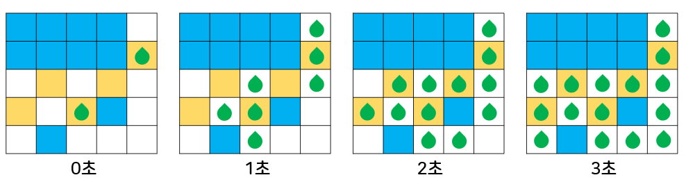 아래는 초록색 배양액 2개를 뿌렸을 때의 예시이다. 하얀색 칸은 배양액을 뿌릴 수 없는 땅을, 황토색 칸은 배양액을 뿌릴 수 있는 땅을, 하늘색 칸은 호수를 의미한다.