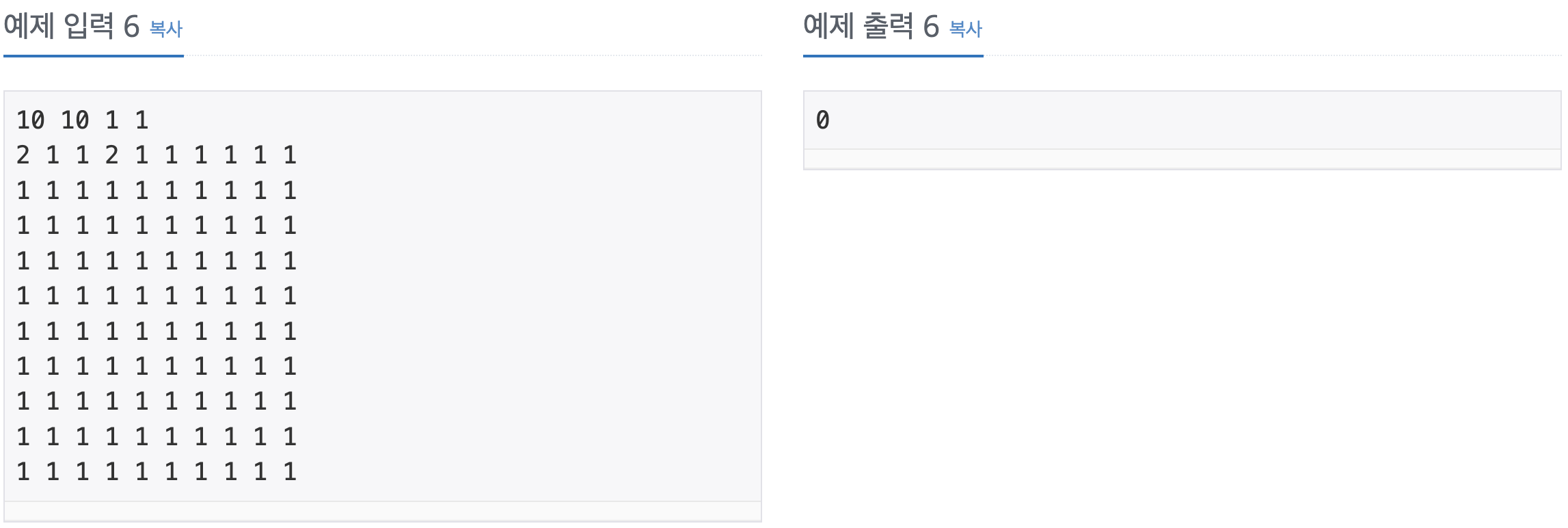 첫째 줄에 정원의 행의 개수와 열의 개수를 나타내는 N(2 ≤ N ≤ 50)과 M(2 ≤ M ≤ 50), 그리고 초록색 배양액의 개수 G(1 ≤ G ≤ 5)와 빨간색 배양액의 개수 R(1 ≤ R ≤ 5)이 한 칸의 빈칸을 사이에 두고 주어진다.