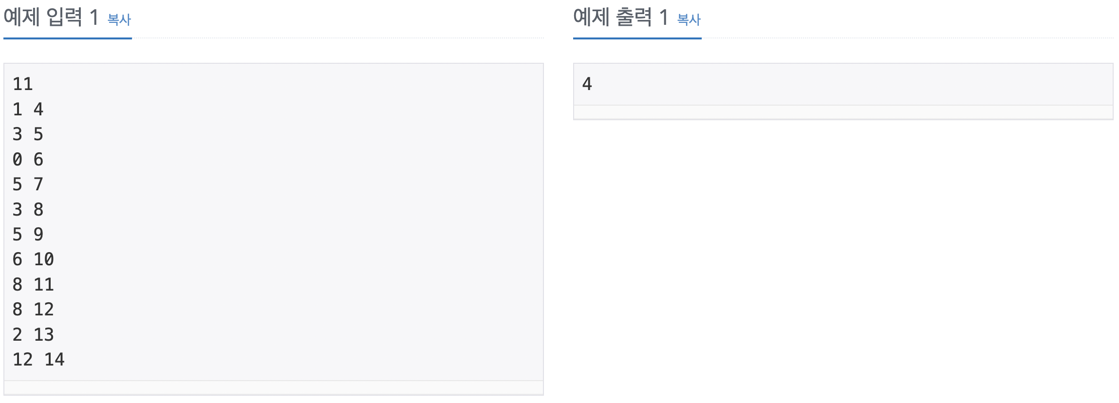 한 개의 회의실이 있는데 이를 사용하고자 하는 N개의 회의에 대하여 회의실 사용표를 만들려고 한다. 각 회의 I에 대해 시작시간과 끝나는 시간이 주어져 있고, 각 회의가 겹치지 않게 하면서 회의실을 사용할 수 있는 회의의 최대 개수를 찾아보자. 단, 회의는 한번 시작하면 중간에 중단될 수 없으며 한 회의가 끝나는 것과 동시에 다음 회의가 시작될 수 있다. 회의의 시작시간과 끝나는 시간이 같을 수도 있다. 이 경우에는 시작하자마자 끝나는 것으로 생각하면 된다.