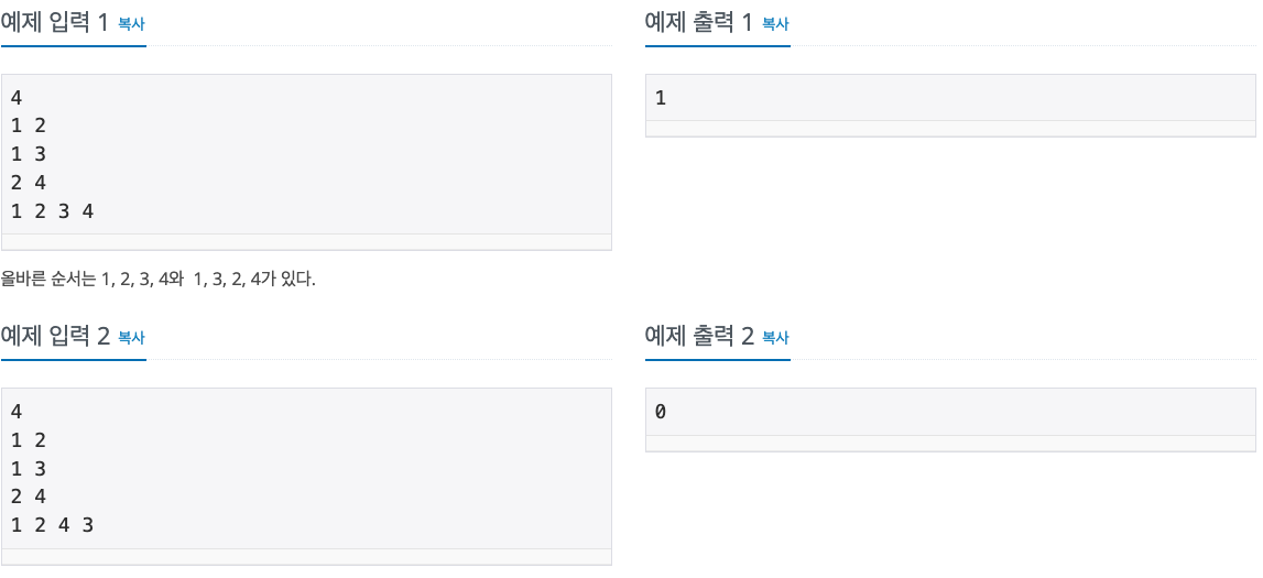 하지만 3을 먼저 방문하기 때문에 1, 3, 2, 6, 4, 5가 맞는 입력이므로 답은 0이다.