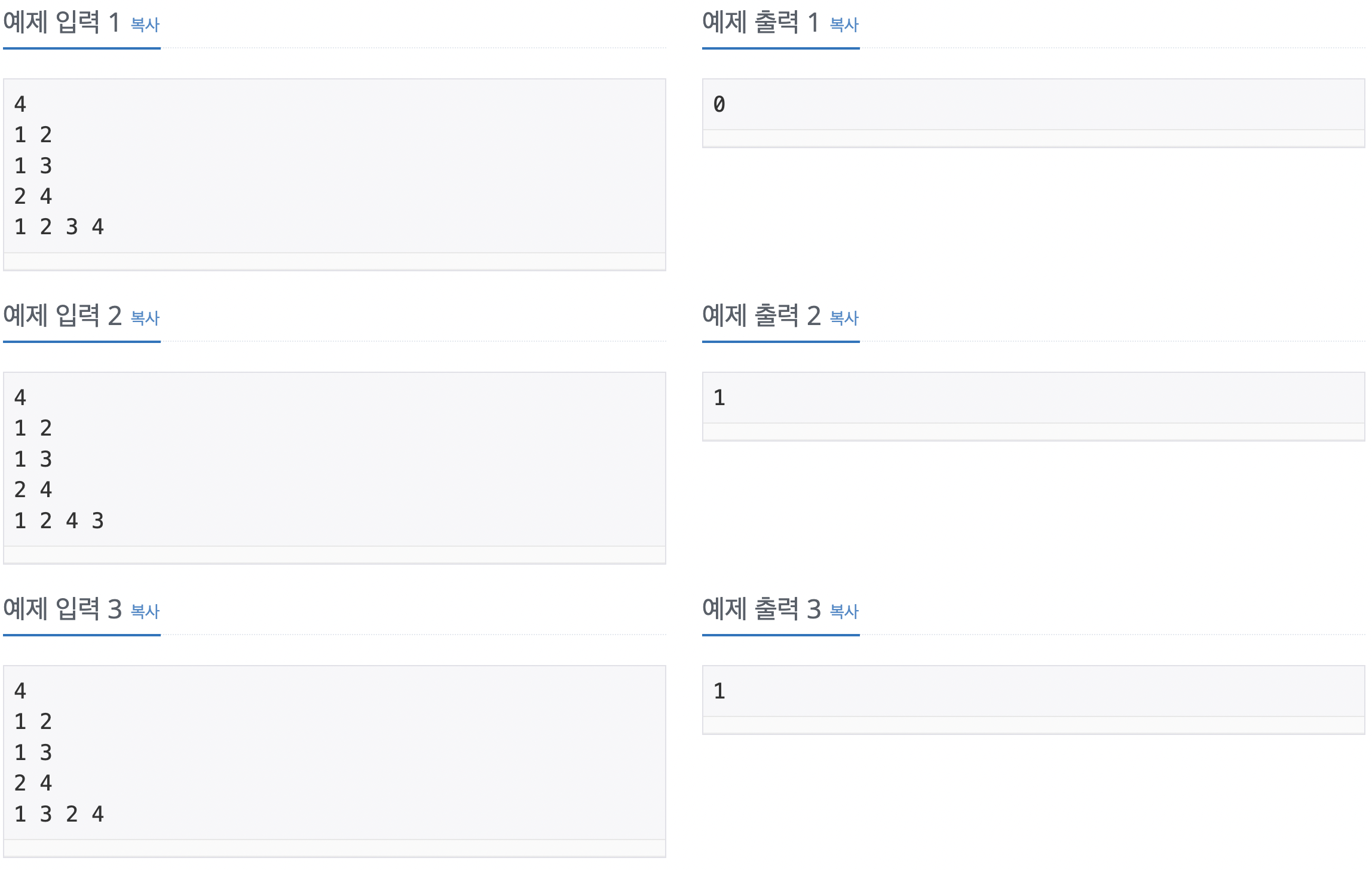 입력으로 주어진 순서대로 간선을 정렬하고 dfs를 돌린다. dfs를 돌리는 중 입력 순서와 다른 값이 나온다면 0을 출력하면 끝!
