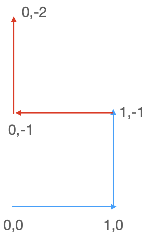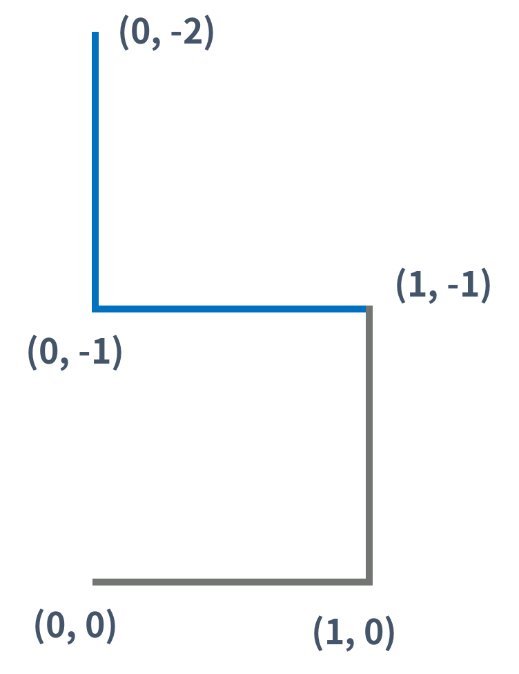 현재 이 배열의 크기는 3이고, 새로 찍을 첫 번째 점은 arr[2]점에서 arr[2]의 방향으로 계산한 새로운 방향으로 점을 찍어서 배열에 추가한다. 그럼 드래곤 커브는 Dragon(0,0,0), Dragon(1,0,0), Dragon(1,-1,1), Dragon(0,-1,2)가 되고, 여기서 점과 선을 하나 더 그려야 하는데 이때는 arr[3]점에서 arr[1]의 방향으로 계산한 새로운 방향으로 점을 찍어서 배열에 추가한다.