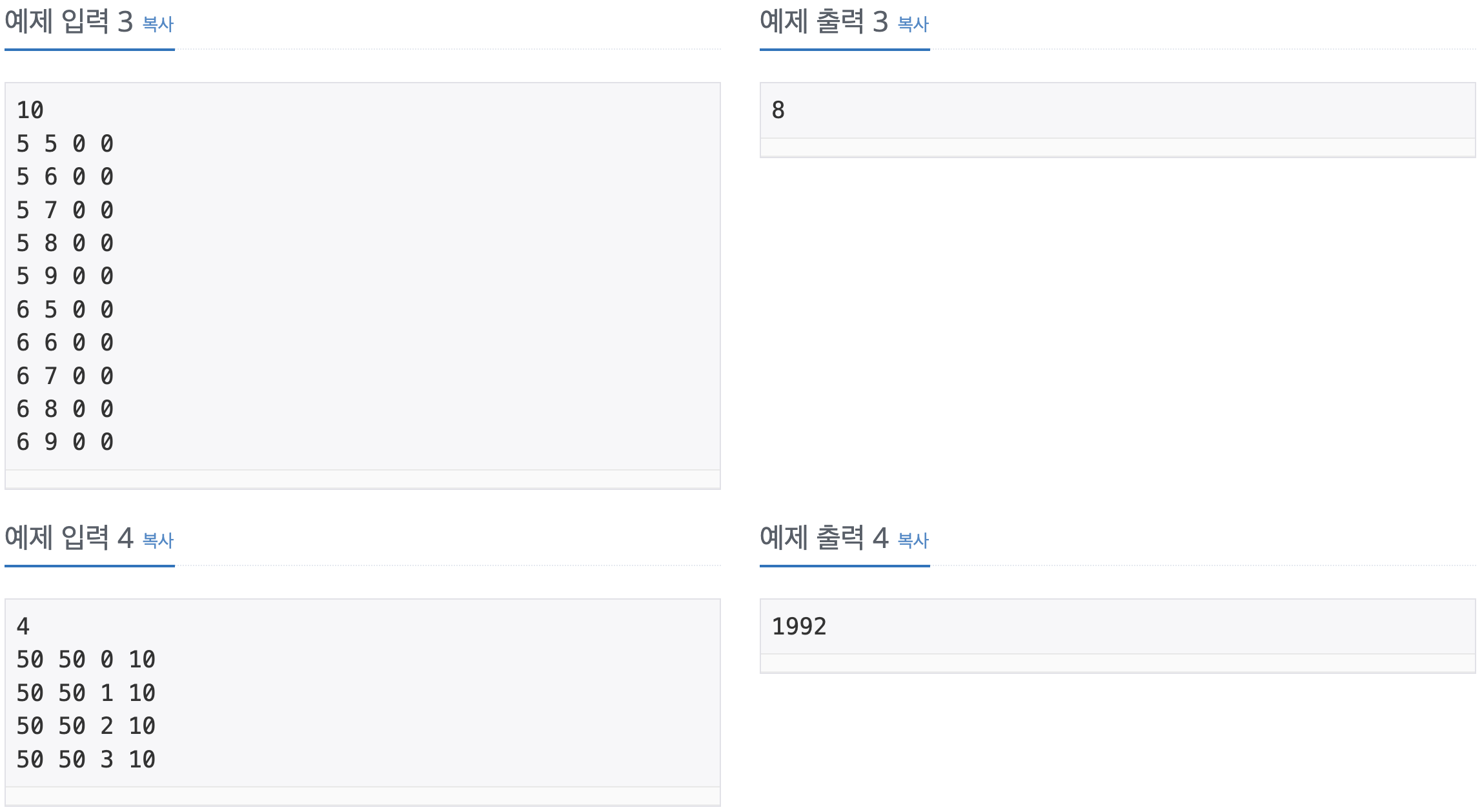 첫째 줄에 드래곤 커브의 개수 N(1 ≤ N ≤ 20)이 주어진다. 둘째 줄부터 N개의 줄에는 드래곤 커브의 정보가 주어진다. 드래곤 커브의 정보는 네 정수 x, y, d, g로 이루어져 있다. x와 y는 드래곤 커브의 시작 점, d는 시작 방향, g는 세대이다. (0 ≤ x, y ≤ 100, 0 ≤ d ≤ 3, 0 ≤ g ≤ 10)
