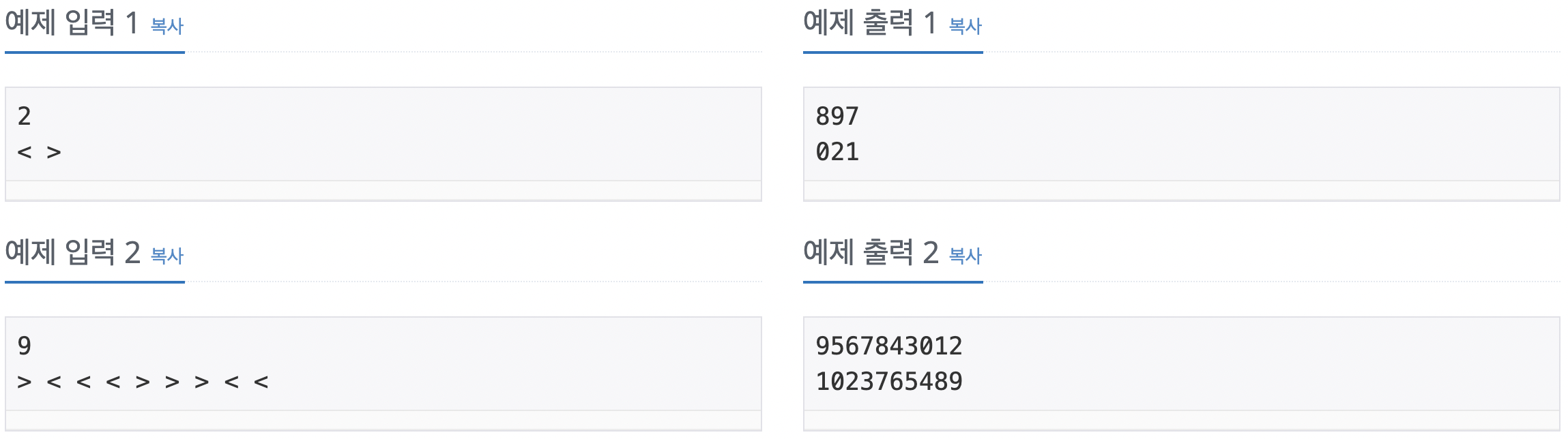 여러분은 제시된 부등호 관계를 만족하는 k+1 자리의 최대, 최소 정수를 첫째 줄과 둘째 줄에 각각 출력해야 한다. 단 아래 예(1)과 같이 첫 자리가 0인 경우도 정수에 포함되어야 한다. 모든 입력에 답은 항상 존재하며 출력 정수는 하나의 문자열이 되도록 해야 한다.
