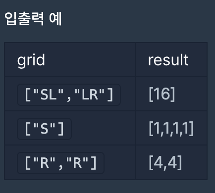 - grid의 모든 문자열은 'L', 'R', 'S'로 이루어져 있습니다.