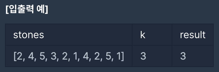 디딤돌에 적힌 숫자가 순서대로 담긴 배열 stones와 한 번에 건너뛸 수 있는 디딤돌의 최대 칸수 k가 매개변수로 주어질 때, 최대 몇 명까지 징검다리를 건널 수 있는지 return 하도록 solution 함수를 완성해주세요.