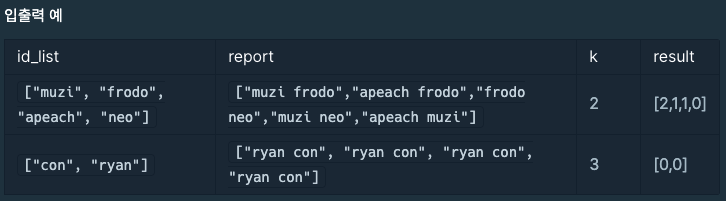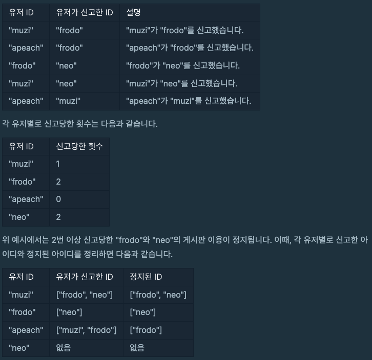 문제 설명 신입사원 무지는 게시판 불량 이용자를 신고하고 처리 결과를 메일로 발송하는 시스템을 개발하려 합니다. 무지가 개발하려는 시스템은 다음과 같습니다. 각 유저는 한 번에 한 명의